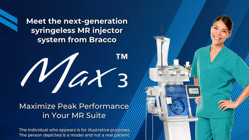 As a Bracco partner, you’re invited to sign up for an exclusive demo of the Bracco Max 3, next-generation syringeless MR injector system. The Bracco Max 3 can transform your MRI suite by decreasing your technologists’ time performing clinical tasks, while maximizing time caring for your patients.